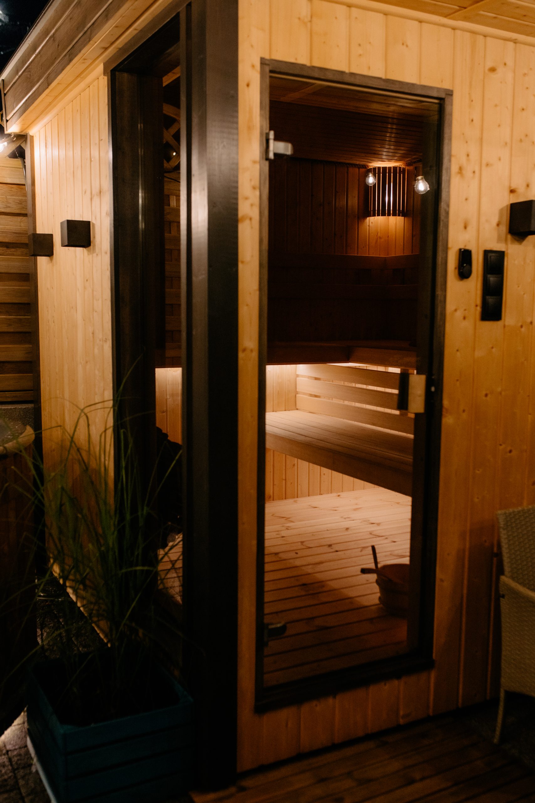 Godzinny seans w saunie 50 zł/ 2 osoby, każda kolejna osoba +25 zł.